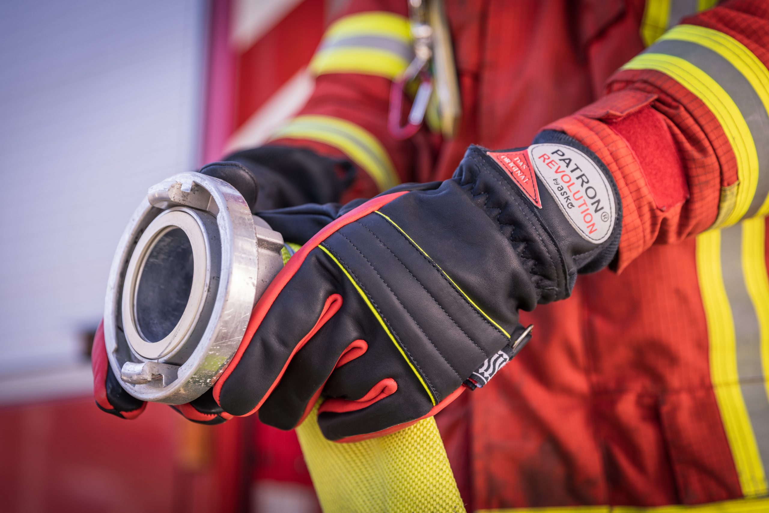 Applications: reflective tapes in yellow/silver/yellow, reflecting label “PATRIOT® Fireproof by askö®”, D-ring and carabiner